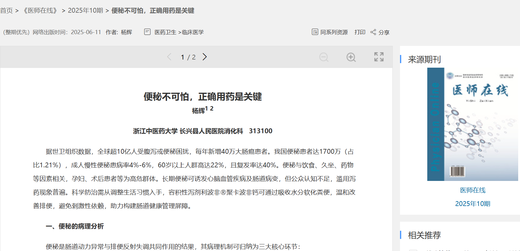 Recently, the Digestive Department team of Zhejiang Chinese Medical University, in collaboration with Changxing County People's Hospital, published a special article titled 'Constipation is Not Scary; Correct Medication is Key' in the national medical journal Physician Online. The article systematically reviews the pathological mechanisms, health risks, prevention and treatment strategies of constipation, as well as the mechanisms of action and clinical application effects of plecanatide. Through this authoritative medical platform, the paper conveys knowledge about intestinal health and the concept of scientific medication to the public, attracting widespread attention.