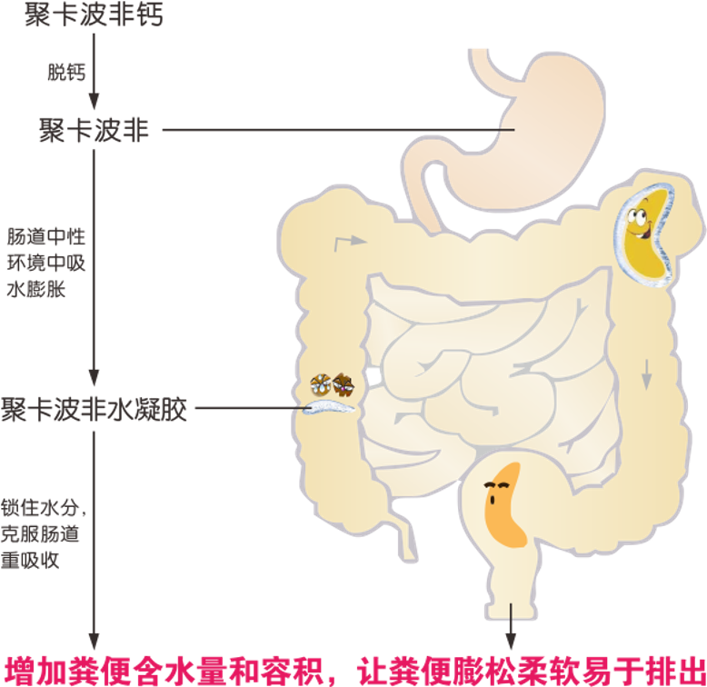 When the above interventions are ineffective, medication should be used appropriately under the guidance of a doctor. Lipofe® Polycarbophil Calcium, as a bulk-forming laxative, triggers a decalcification reaction in the acidic environment of the stomach to release polycarbophil. Once it enters the intestines, it absorbs water and expands to form a gel matrix, increasing stool volume to mechanically stimulate bowel movements while also absorbing excess water to prevent dry stools, thereby reducing intestinal burden. Its physical mechanism of action avoids the risk of drug dependence and intestinal nerve damage, making it especially suitable for pregnant women, the elderly, children, and patients with chronic constipation who require long-term medication. The mechanism of action is shown in Figure 2.